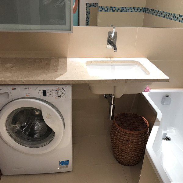 w mieszkaniu szafy w zabudowie, kuchnia wyposażona, łazienka z wanną i pralką.