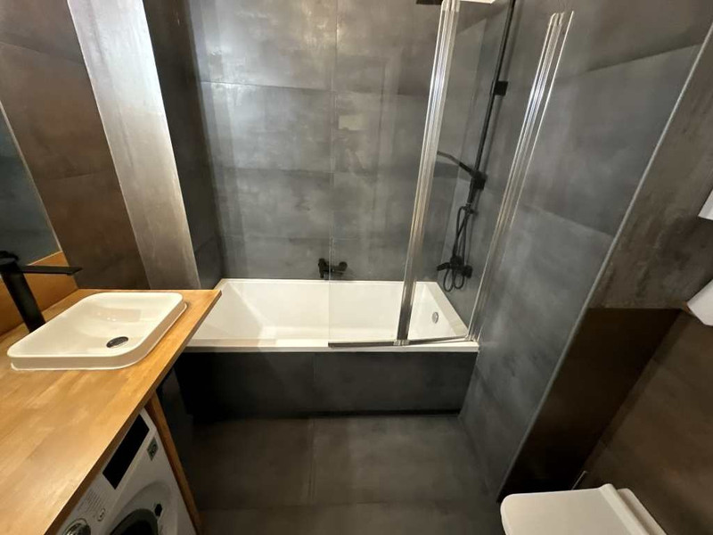 Łazienka wykończona jest w nowoczesnym stylu, wyposażona w wannę, umywalkę z szafką oraz toaletę. W mieszkaniu jest pralka.