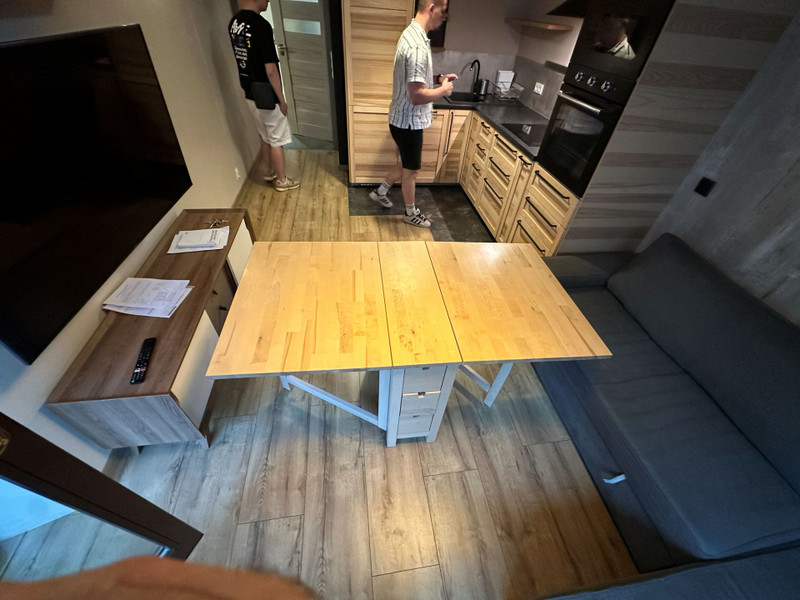 Salon wyposażony jest w sofę, stolik kawowy, telewizor, szafkę RTV oraz strefę jadalnianą z blatem, stołem i krzesłami. Przestrzeń dzienna jest połączona z aneksem kuchennym.