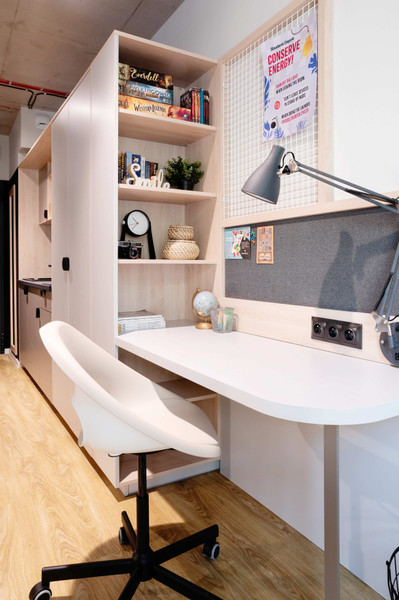 A modern apartment with a private bathroom and kitchenette, located in a private student residence just a short distance from the metro.