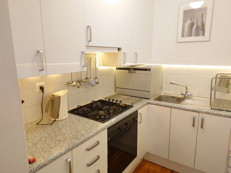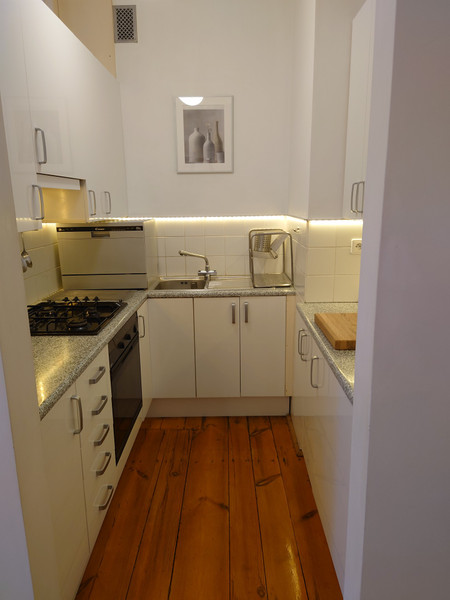 Dużo szafek. Drzwiczki z zawiasami na cichy domknięcie, 5 szuflad, lodówka podblatowa z zamrażalnikiem wbudowana, wydajny okap wbudowany, zmywarka, piekarnik z płytami katalitycznymi, płyta gazowa na 4 palniki, kuchenka mikrofalowa, czajnik elektryczny, komplet garnków, talerzy, sztućców, kubków, filiżanek, kieliszków i inne wszystko na 6 osób, wysuwane na prowadnicach kosze.