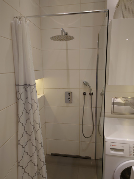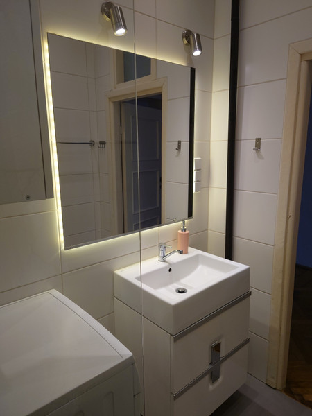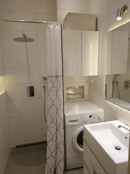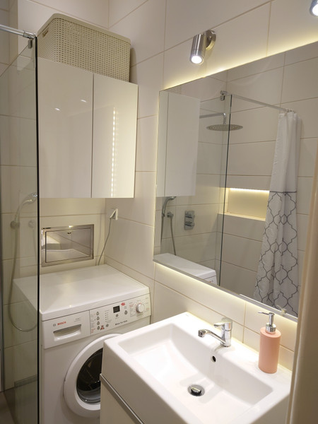Prysznic włoski otwarty z deszczownicą i podświetlana led półka na przybory do mycia, umywalka 50 cm. z szafką z dwoma szufladami, lustro podświetlane led i dodatkowe 2 spoty, pralka pełnowymiarowa otwierana z przodu, szafka ścienna na przybory i ręczniki, kosz na rzeczy do prania.