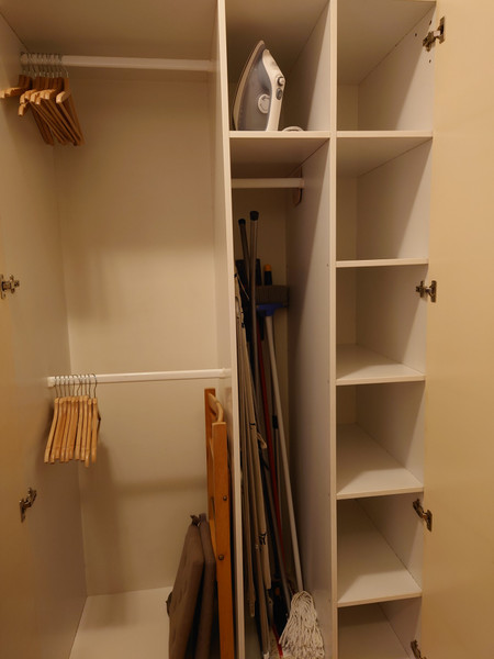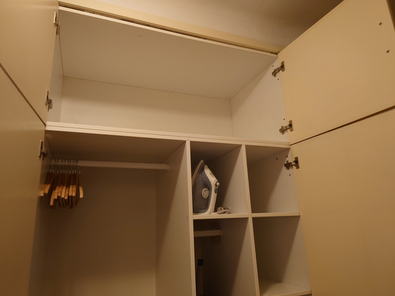 Duża szafa ubraniowa z pawlaczem do sufitu wbudowana, duże lustro, komoda z szufladami, odkurzacz, deska do prasowania, żelazko, 10 haczyków na ubrania.