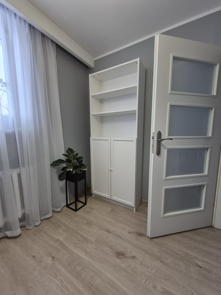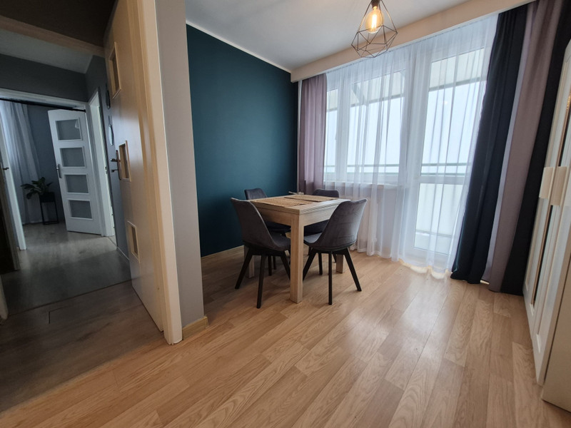1. Pokój nr 1 (większy z jadalnią): Wyposażony w wygodne łóżko, dużą szafę z lustrem, regał, a także stół z krzesłami (funkcja jadalniana/do pracy). Pokój jest bardzo jasny dzięki dużym oknom balkonowym.