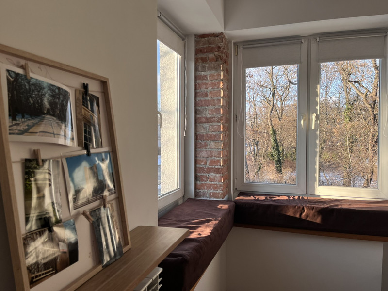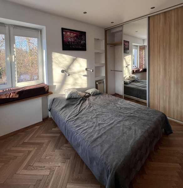 Przestronna sypialnia z narożnymi oknami, obniżonymi parapetami do siedzenia i widokiem na Park Dreszera. Na całej szerokości jednej ze ścian znajduje się przestronna szafa w zabudowie – z wieszakami, szufladami, półkami i miejscem do przechowywania na górze. Łóżko IKEA z 4 szufladami. W rogu miejsce np. na biurko.
