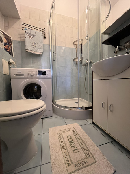 Łazienka z jasnoniebieskimi płytkami, pralką i kabiną prysznicową.