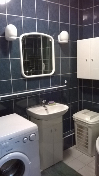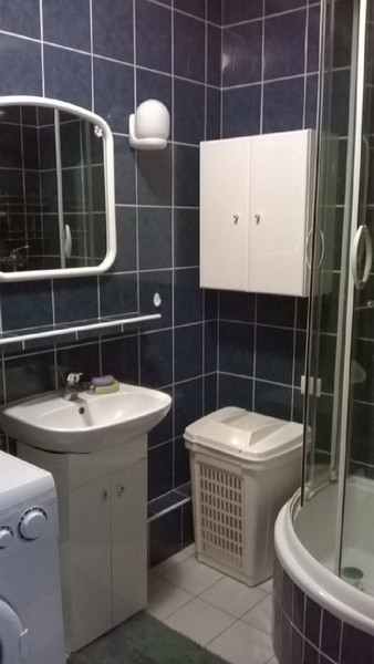 W łazience prysznic z głębszym brodzikiem i pralka.