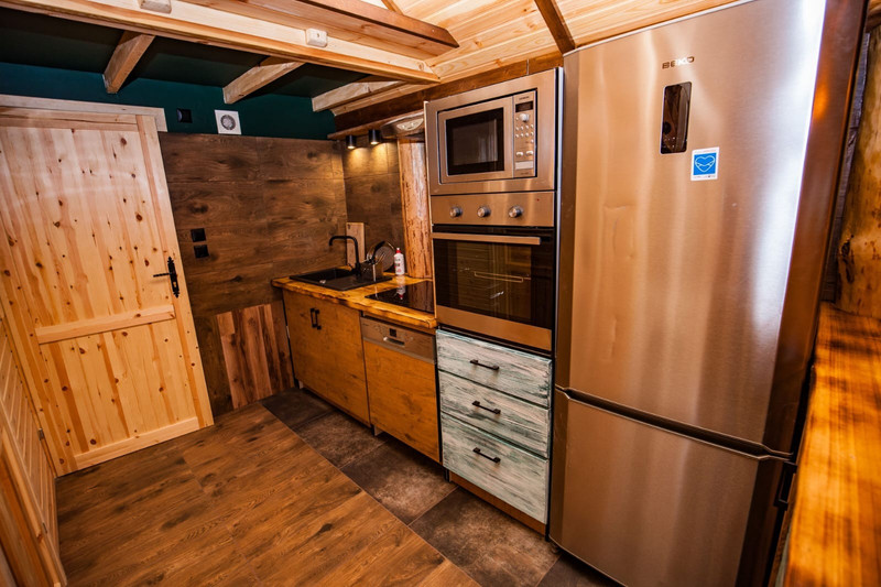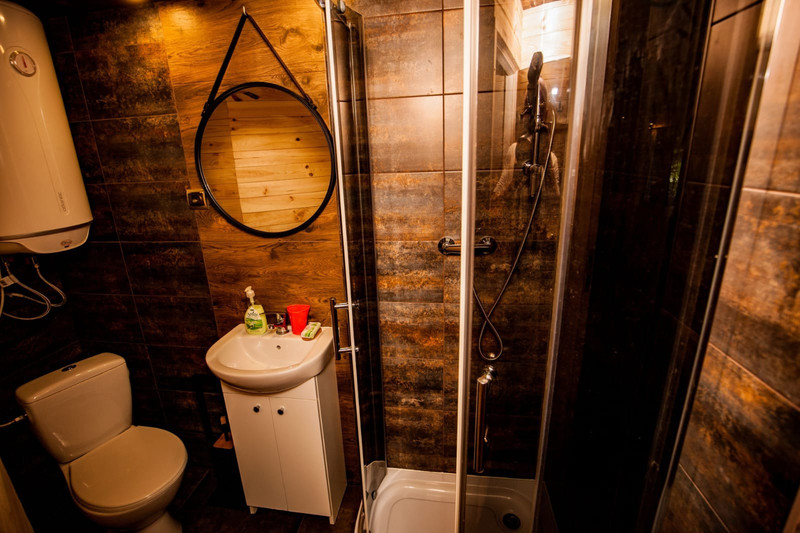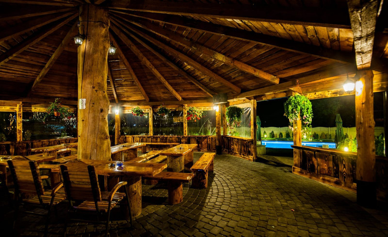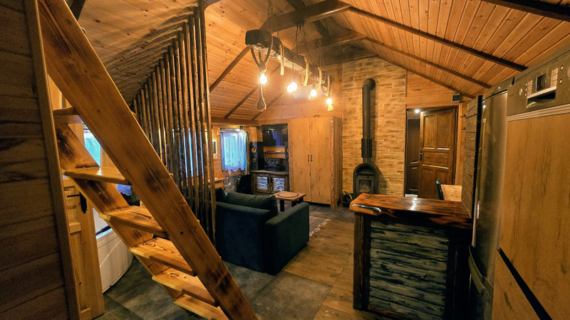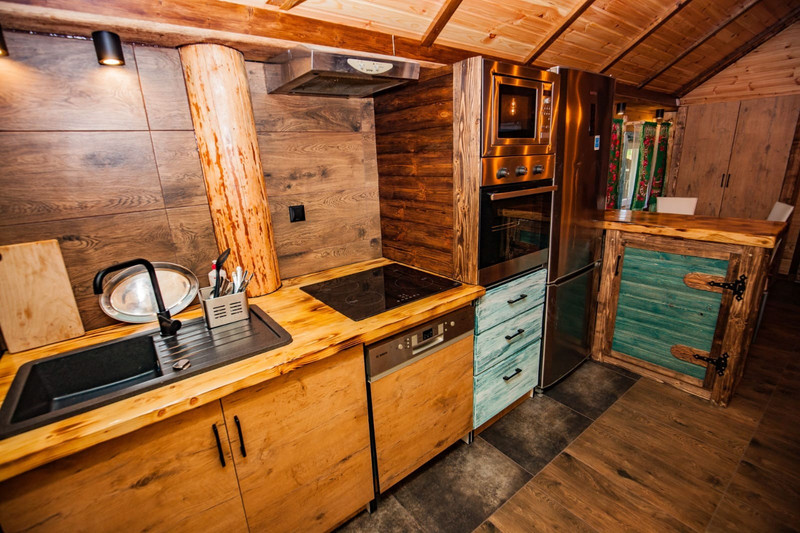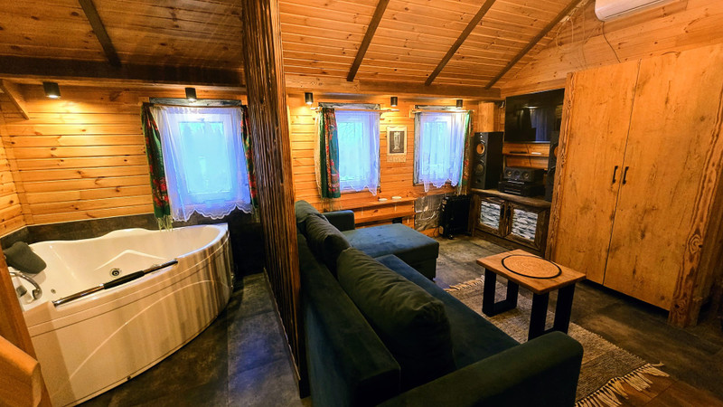 - wielka drewniana chata, a w niej sofy, ławy, komin z rożnem, profesjonalny piec do pizzy, duży tv