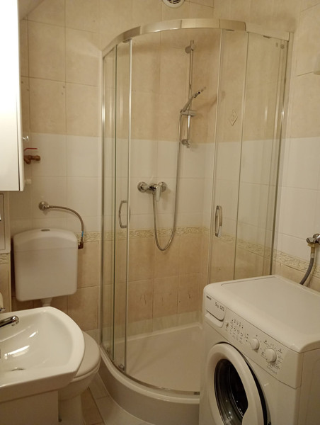 * W łazience nowy prysznic, umywalka, toaleta, pralka