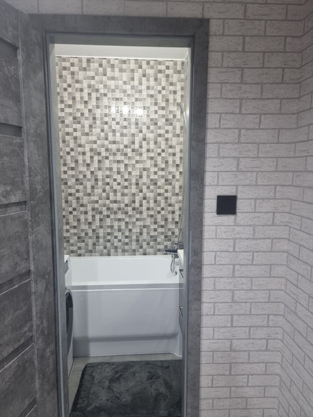 W łazience: biały montaż, wanna, umywalka, pralka, szafki.