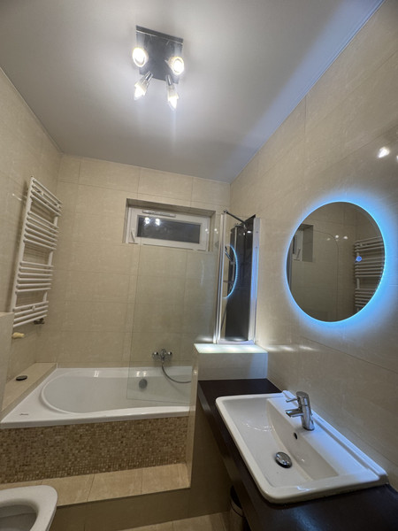 Mieszkanie jest świeżo po remoncie. Jest w pełni umeblowane i wyposażone w niezbędne sprzęty AGD (lodówka, pralka, piekarnik firmy Bosch). Składa się z bardzo dobrze doświetlonego salonu z aneksem kuchennym, trzech sypialni, dwóch łazienek, garderoby oraz dużej oszkolonej logi.