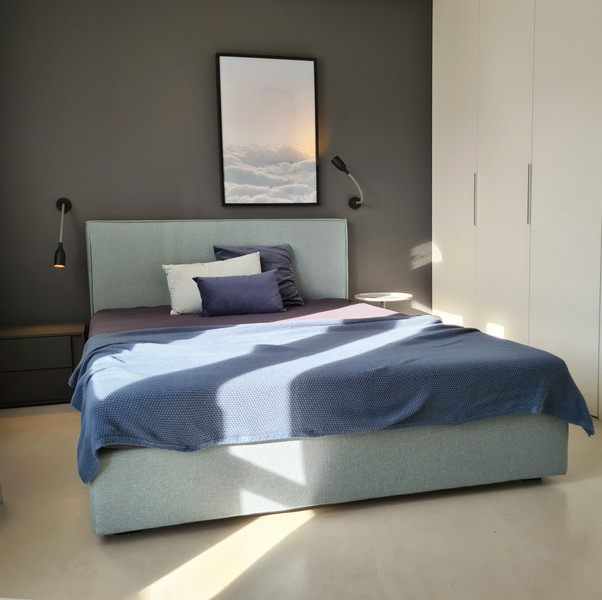 W sypialni łóżko dwuosobowe 160cm, sporo szaf, regał na książki. Wyjście na balkon.