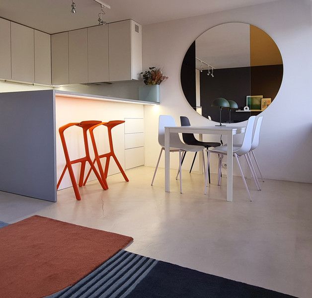 Stół na maksymalnie 8 osób, dwa hokery do siedzenia przy barku.
