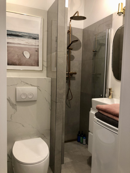 Umeblowane i wyposażone w nowy sprzęt AGD (zmywarka, płyta elektryczna, lodówka, piekarnik, pralka). Łazienka z kabiną prysznicową.