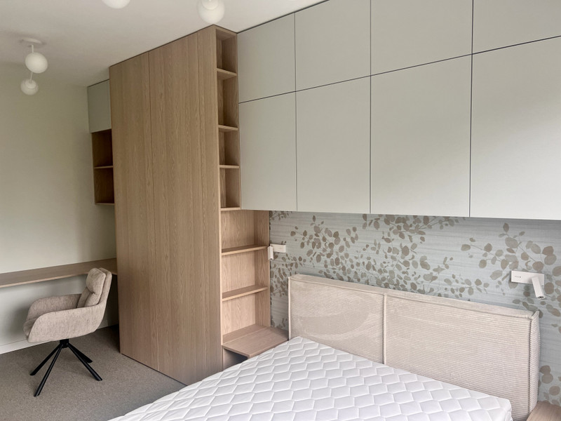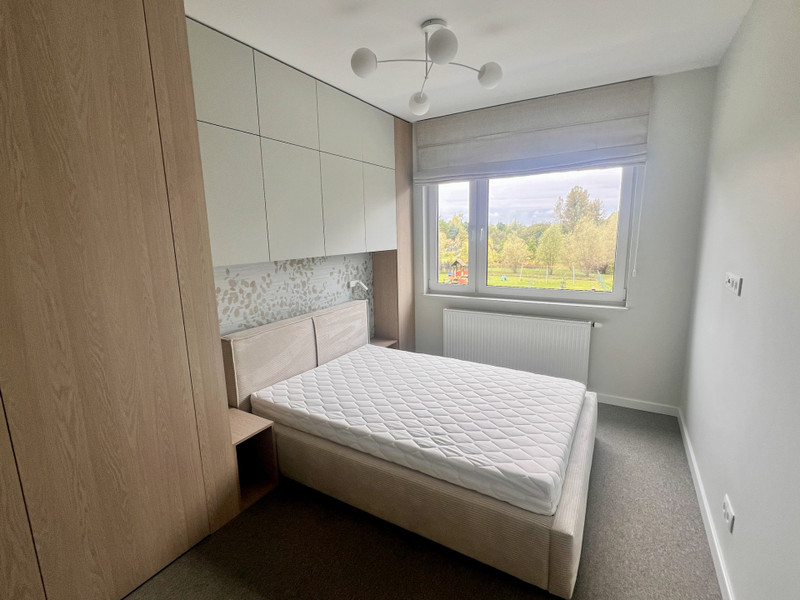 Przestronna sypialnia wykończona wysokiej jakości wykładziną dywanową. W pełni umeblowana.