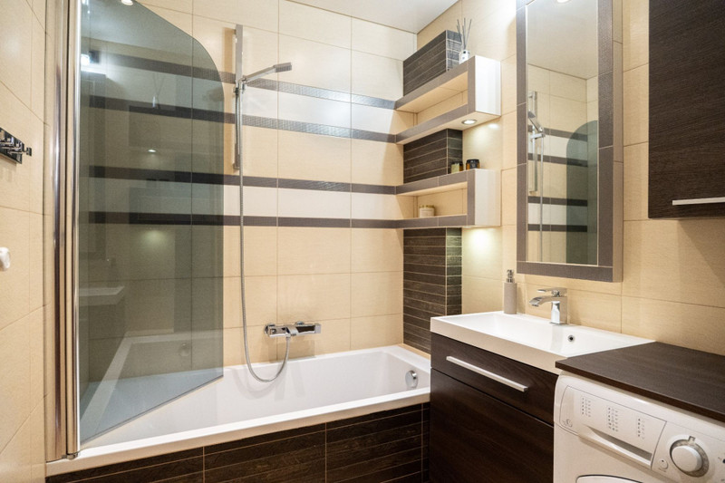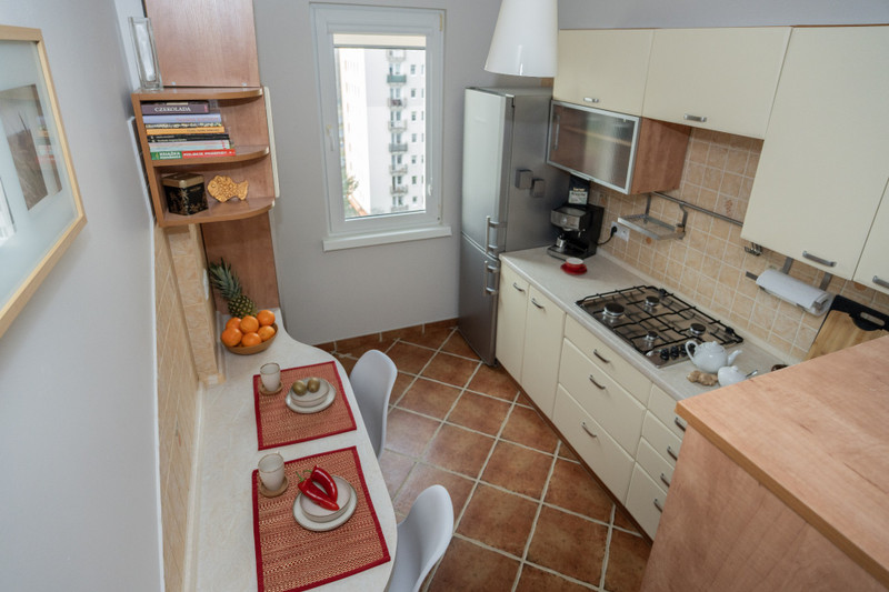 Kuchnia jest w pełni wyposażona w sprzęt tj. piekarnik, płyta gazowa,zmywarka, lodówka, ekspres do kawy. Osobna łazienka i ubikacja. Łazienka z wanną, wyposażona w pralkę. W ubikacji mała umywalka.