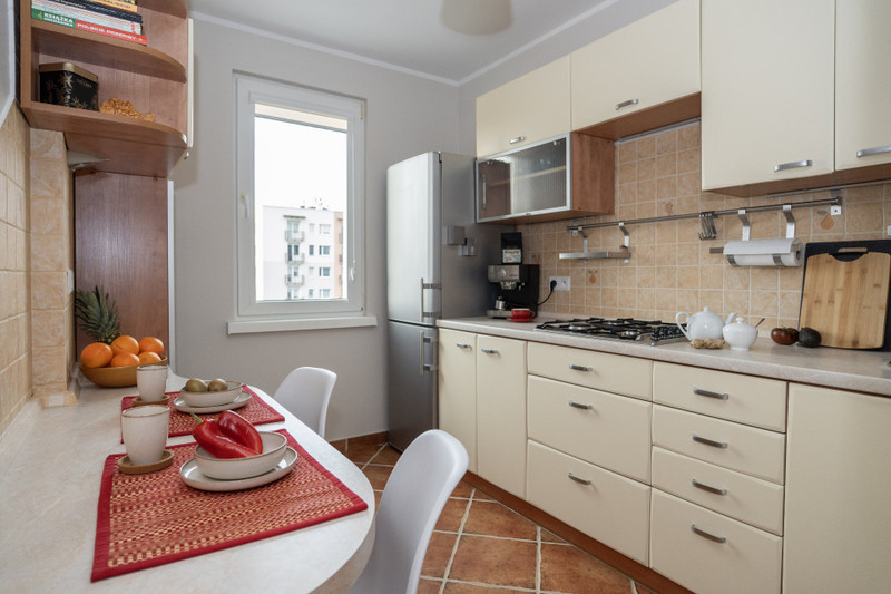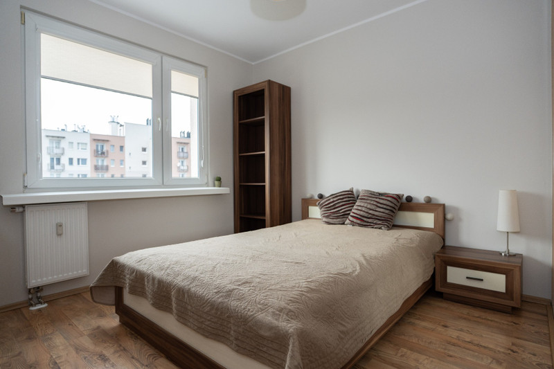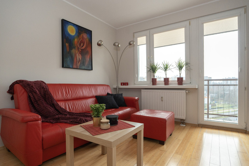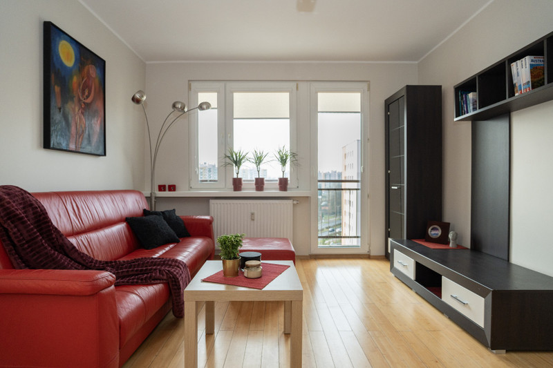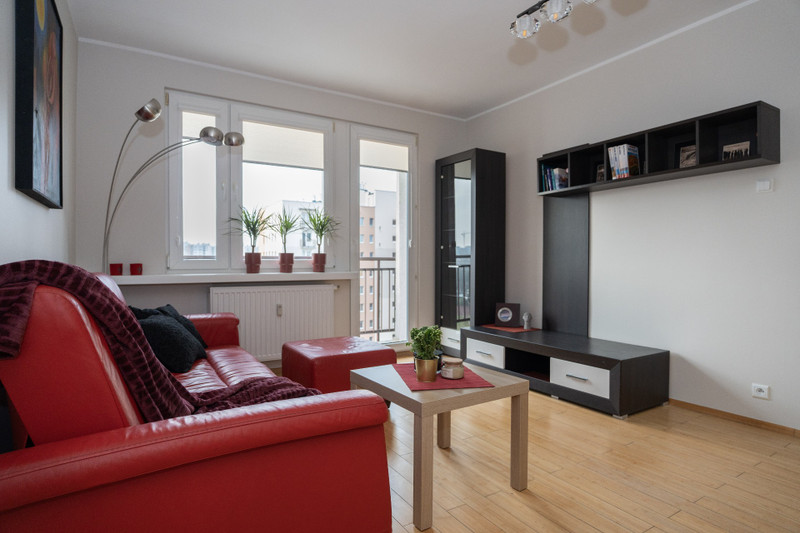 Mieszkanie o powierzchni 63 m² na 8. piętrze. Wnętrza są jasne i słoneczne.
