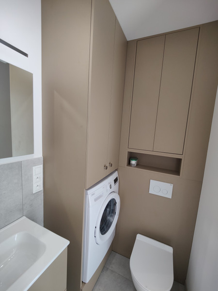 Łazienka z prysznicem, pralką i meblami, Przestronny hol z szafa w zabudowie, Przestronna sypialnia wyposażona w szafę w zabudowie oraz biurko lub toaletka.