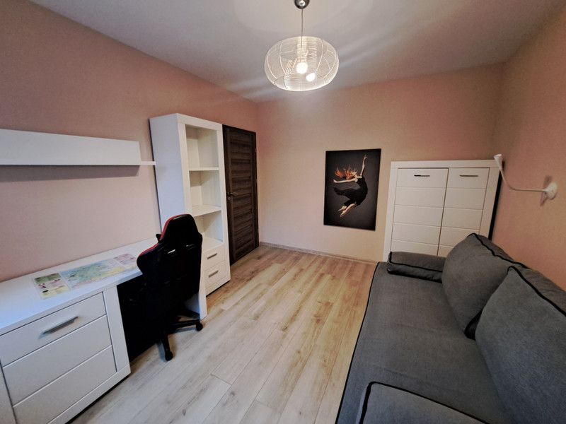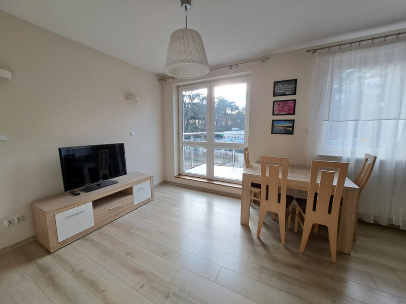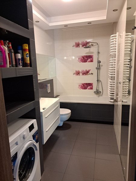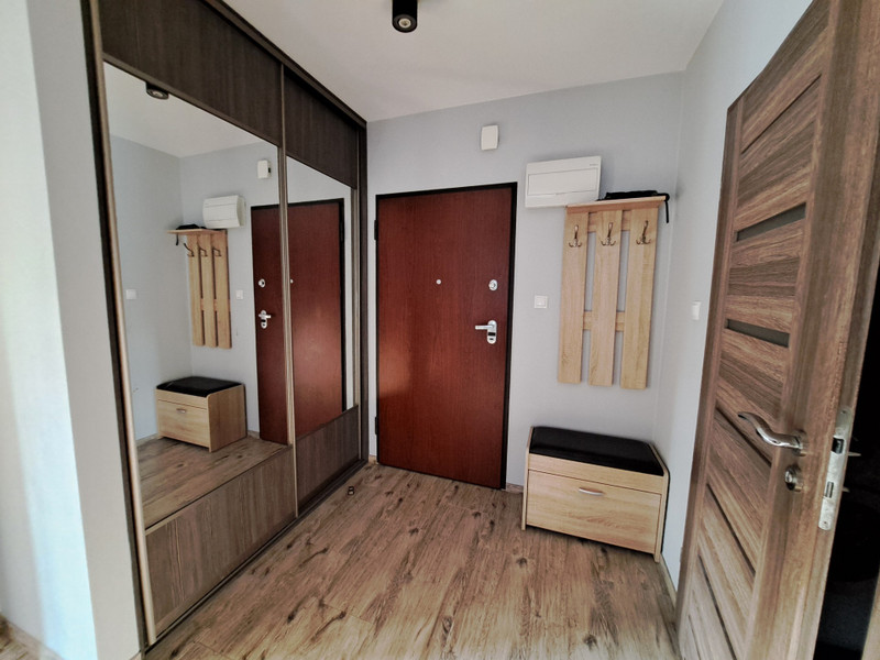 Mieszkanie wykończone w wysokim standardzie. W salonie znajdują się wygodna kanapa, komody, telewizor, stół jadalniany z czterema krzesłami oraz wyjście na balkon. W drugim pokoju-który może pełnić funkcję sypialni lub gabinetu- znajduje się biurko, witryna na książki, szafki oraz kanapa rozkładana do pozycji spania. Kuchnia z zabudową w bieli, wyposażona została we wszystkie niezbędne sprzęty AGD: płyta indukcyjna czteropalnikowa, zmywarka, lodówka w zabudowie, piekarnik. W łazience komfortowa wanna z parawanem oraz pralka. W przedpokoju wieszaki na okrycia wierzchnie oraz pojemna szafa wnękowa typu KOMANDOR.