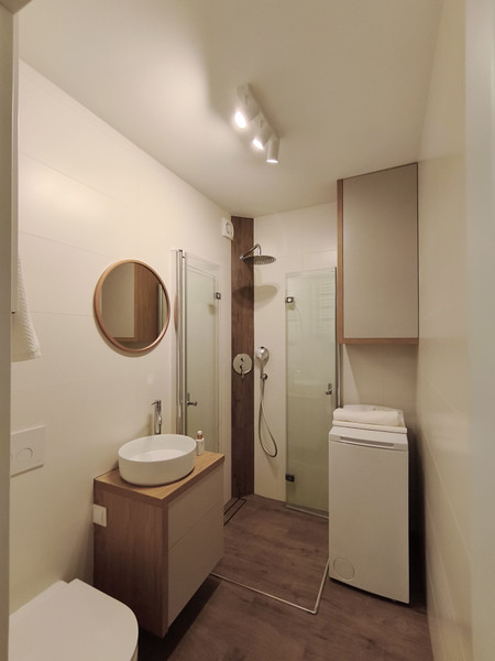 • Łazienka nowocześnie wykończona, prysznic, pralka, szafki do przechowywania, suszarka do wlosów, suszarka na bielizne