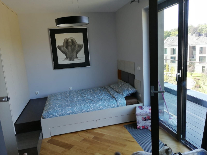 • Sypialnia – z podwójnym łóżkiem, dużą szafą i przestrzenią do pracy zdalnej dla dwóch osób