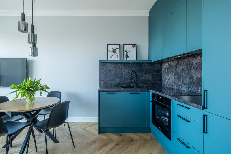 Salon z aneksem kuchennym: w pełni wyposażony i umeblowany, sofa, stół, krzesła, komody, zabudowa kuchni, zmywarka, piekarnik, płyta indukcyjna, wyjście na przestronny balkon,
