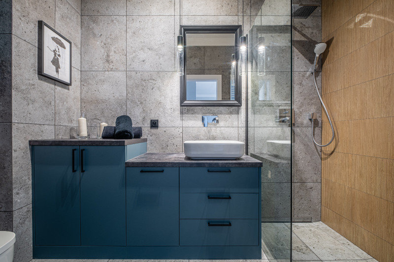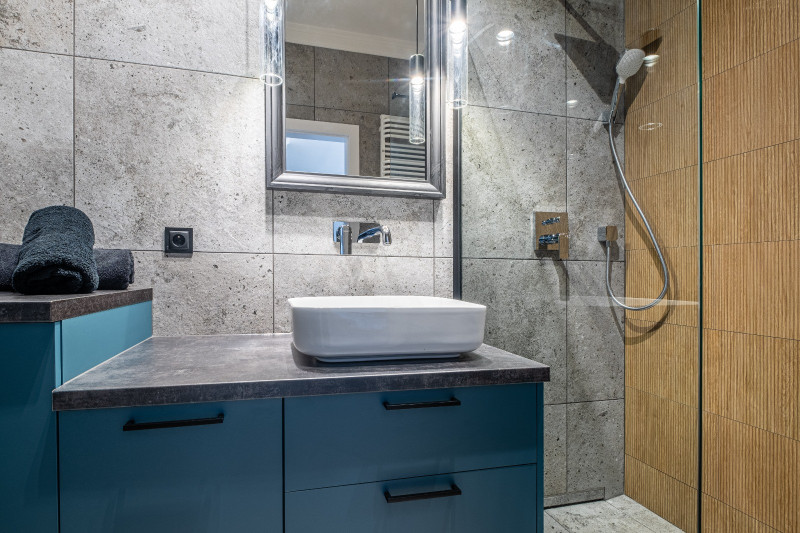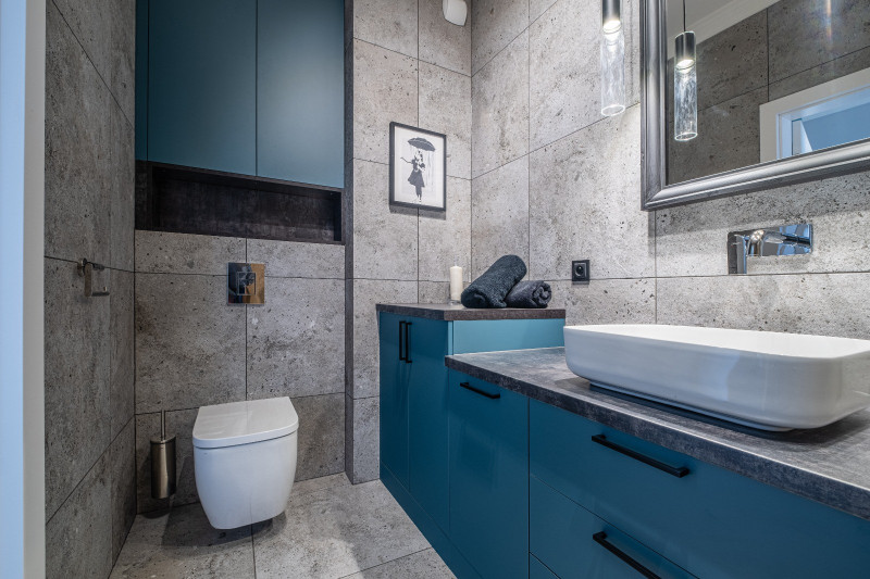 Łazienka: prysznic, szafki pod umywalką, toaleta, pralka,