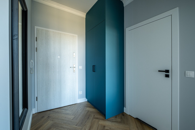 Przedpokój: pojemna szafa, szafka na buty, lustro,