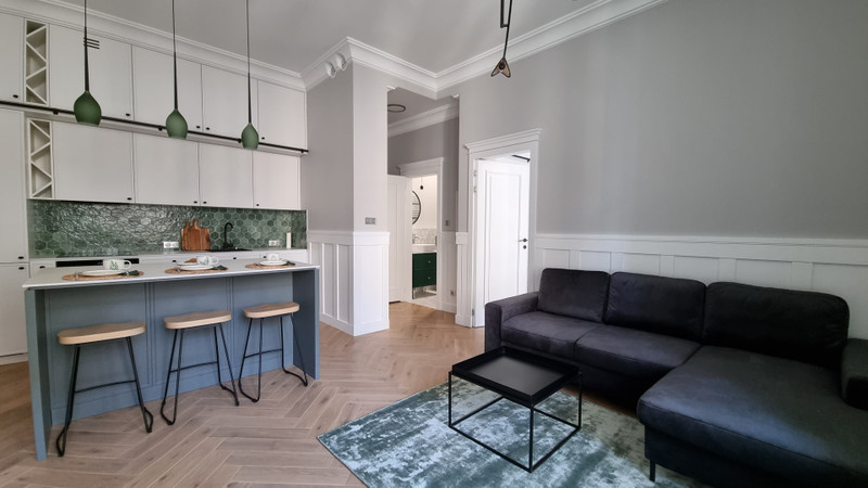 Mieszkanie składa się z salonu z aneksem kuchennym (z dużą wyspą), sypialni, łazienki, korytarza i dużego 11-metrowego balkonu (w pełni umeblowanego). Zostało starannie wykończone z materiałów wysokiej jakości (w tym dębowy parkiet). Wnętrze jest przestronne, wysokie 3,35m, bardzo jasne, z każdego pokoju jest wyjście na balkon. Apartament jest w pełni umeblowany (w tym duża 4-drzwiowa szafa) i wyposażony w sprzęty AGD (pralko-suszarka, zmywarka, lodówka, płyta indukcyjna, piekarnik, okap). Światłowód INEA - wg potrzeb Najemcy.