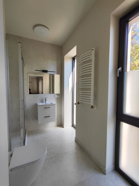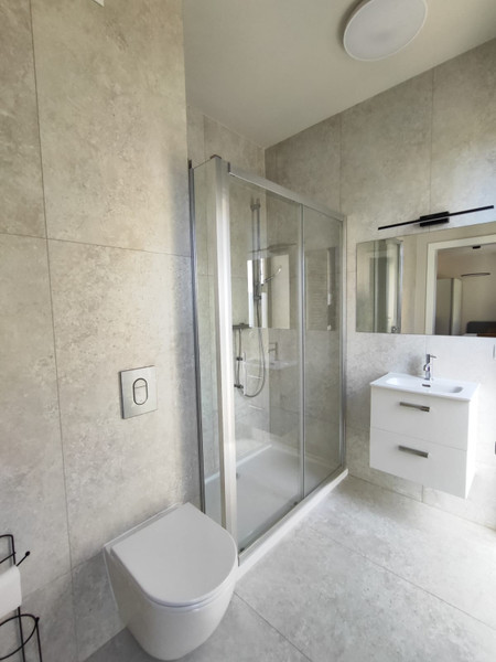 Łazienka została wyposażona w geberit, prysznic oraz umywalkę z szafką i lustro. Na podłodze i ścianach zastosowano nowoczesne płytki typu gres.