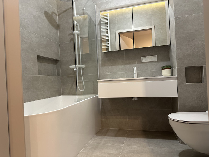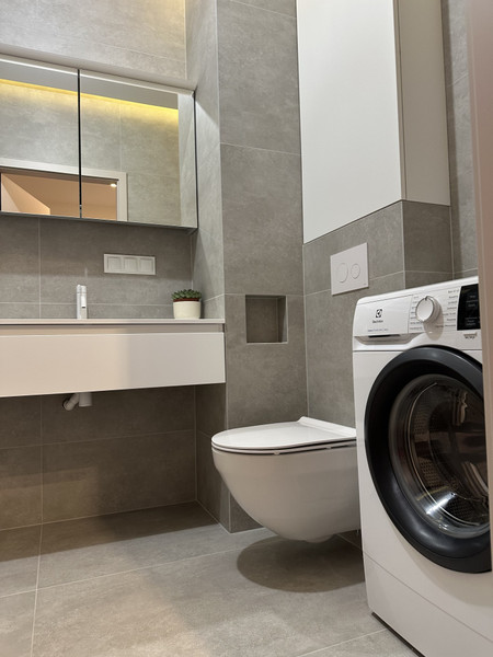 Mieszkanie składa się z trzech pokoi, dwóch łazienek oraz osobnej kuchni. We wszystkich pokojach zamontowane są rolety.