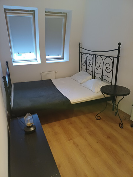 W oddzielnej sypialni jest łóżko w wymiarach 160cmx200cm, stolik, komody.