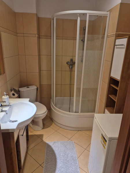 W łazience jest kabina prysznicowa, pralka i szafki.