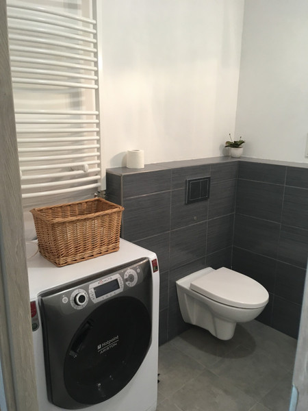 Łazienka posadzka i ściany w płytkach, kabina prysznicowa, WC kompakt, umywalka, pralka, szafka.