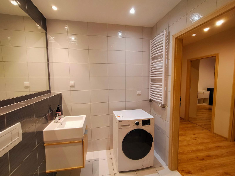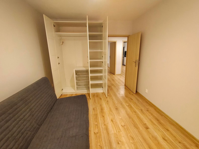 W salonie rozkładana kanapa, szafka RTV wraz z TV i zestawem HiFi . Stąd też wyjście na słoneczny balkon. W sypialni małżeńskie łóżko, pojemna szafa . W łazience ładne płytki, kabina prysznicowa, pralka.