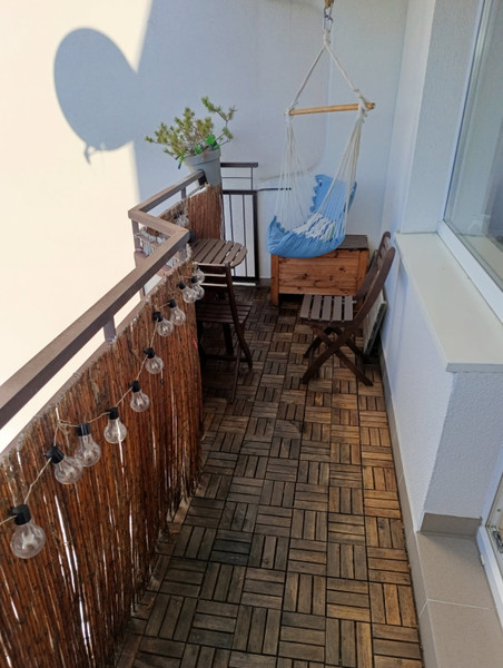 Mieszkanie składa się z salonu połączonego z balkonem, widok z balkonu na zieleń,