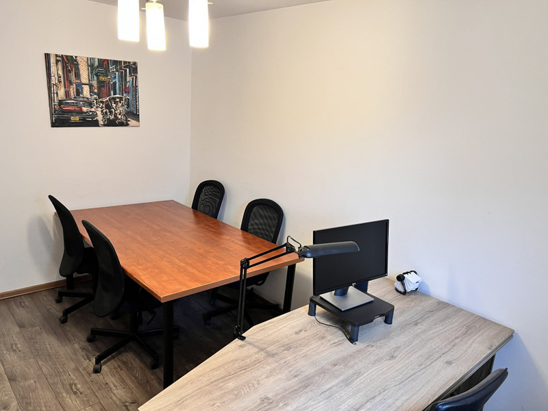 W kolejnym mniejszym pokoju obecnie stoi jedno duże biurko oraz stół konferencyjny.