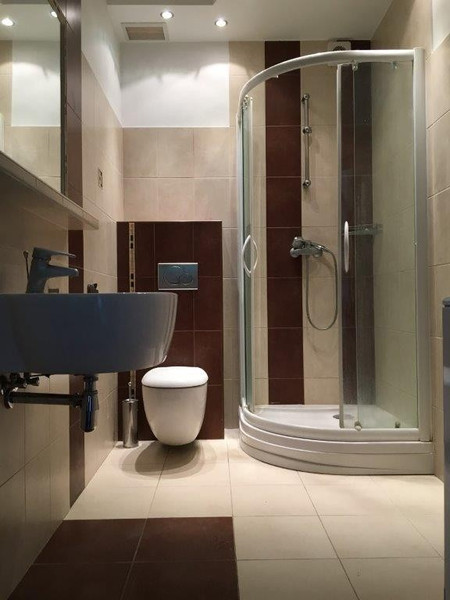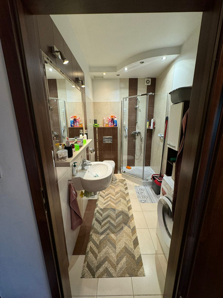 - Łazienka z prysznicem, pralką, wc, oraz umywalką.