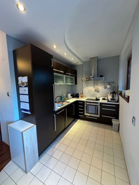 - Aneks kuchenny z zabudową, wyposażony w niezbędny sprzęt AGD (lodówko-zamrażarka, płyta elektryczna, piekarnik, pochłaniacz, zmywarka).
