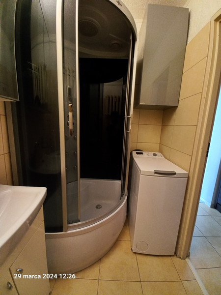 W łazience pralka, kabina prysznicowa z panelem sterowania zaopatrzonym w radio zapewniające maksymalny relaks podczas kąpieli.