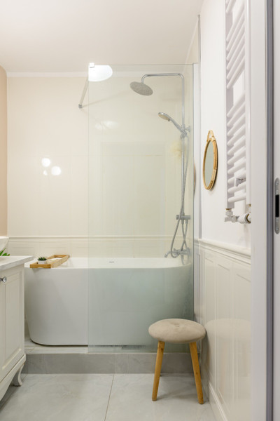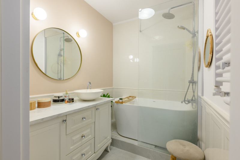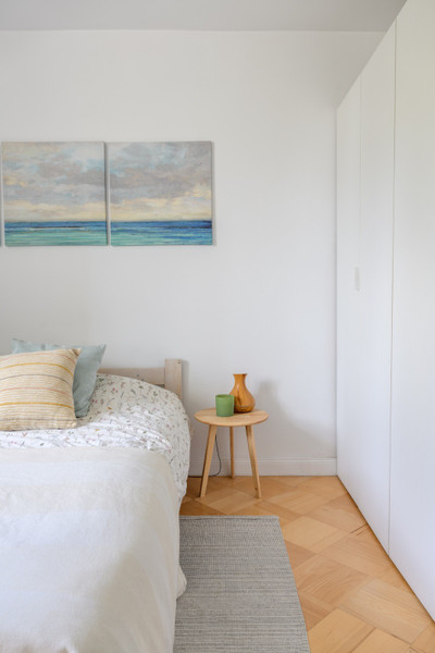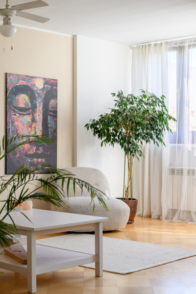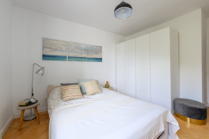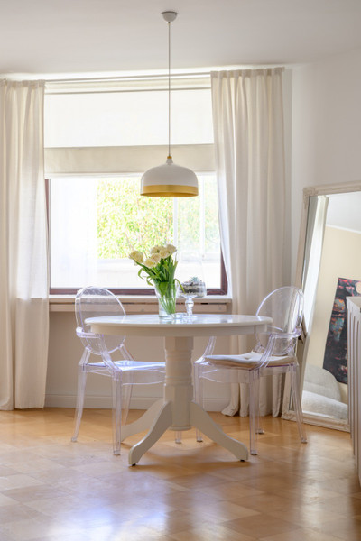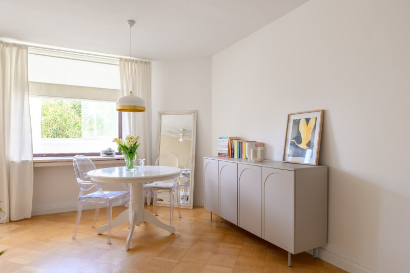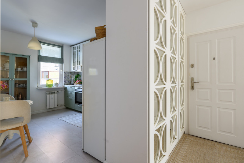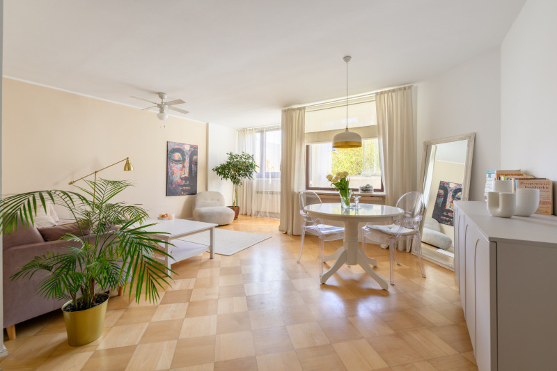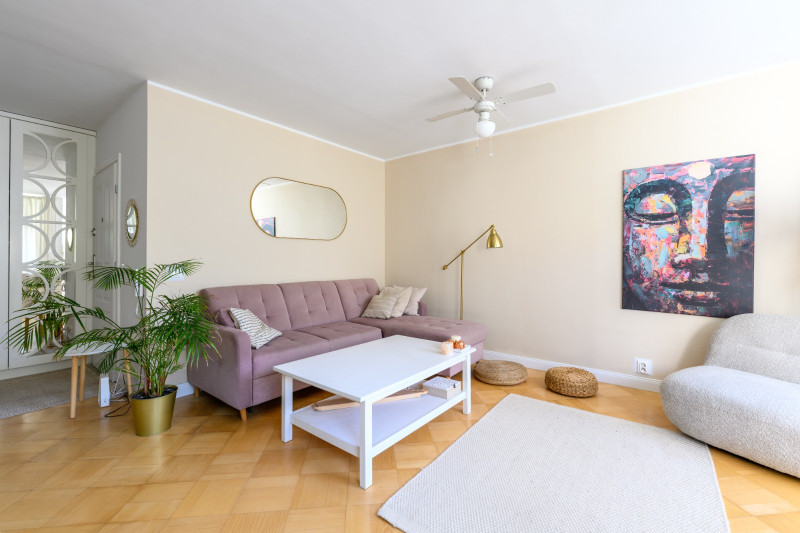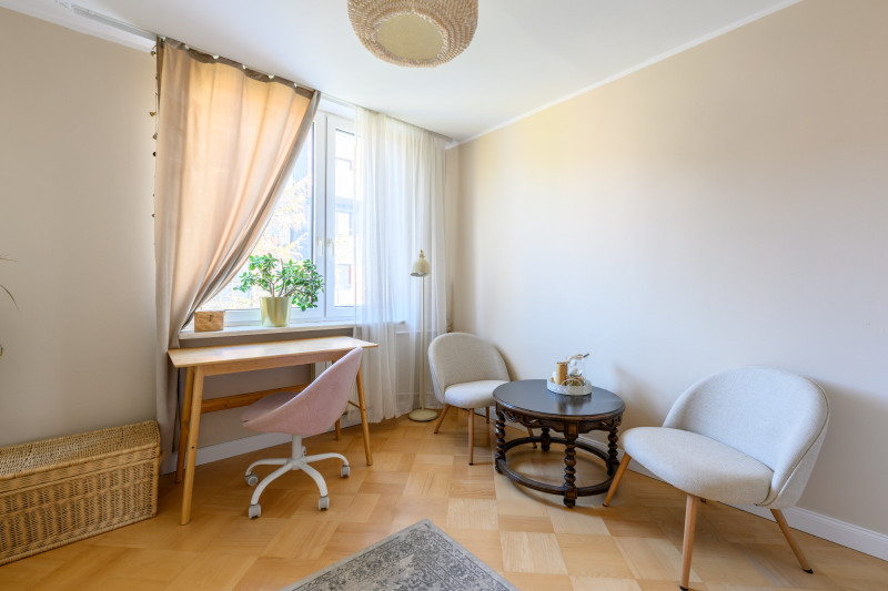 Mieszkanie ulokowane jest na ostatnim piętrze, co zapewnia ciszę i bardzo duży komfort. W mieszkaniu, o powierzchni 73 m, znajduje się jeden duży pokój z rozkładaną sofą, sypialnia z dużą szafą oraz gabinet, który może pełnić funkcję dodatkowej sypialni z miejscem do pracy.