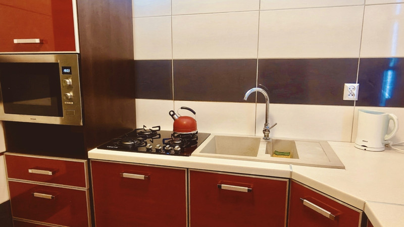 - Kuchnia: lodówko‑zamrażarka, płyta gazowa, zmywarka, mikrofalówka, stolik.