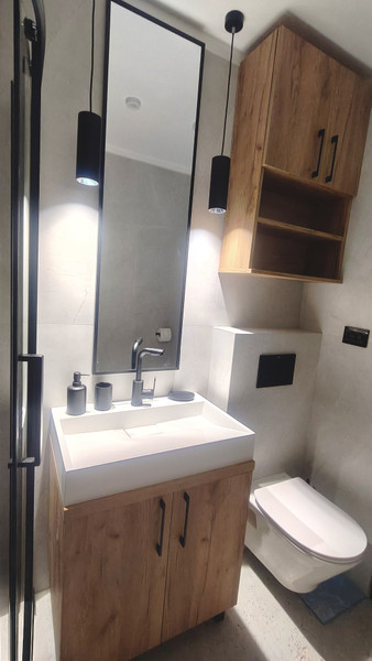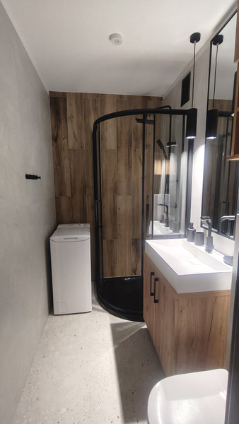 - Łazienka: kabina prysznicowa 90 cm, pralka, sanitariaty, szafki.
