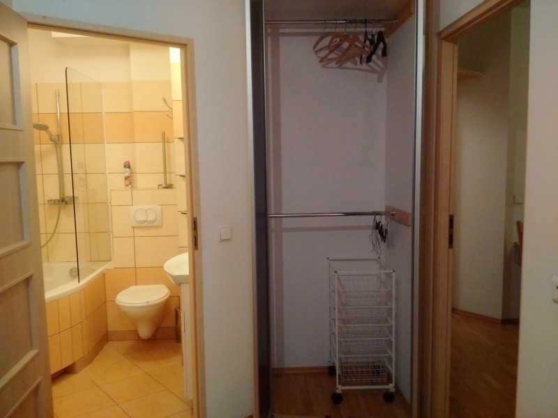 Mieszkanie umeblowane i wyposażone. Mieszkanie z łazienką i osobnym WC. Posiada dwie duże garderoby i wewnętrzny schowek. Dodatkowo dostępny schowek w piwnicy. W oknach rolety zewnętrzne.