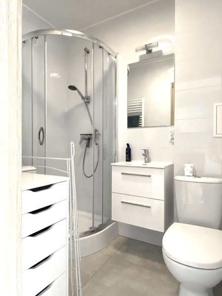 rozkładane łóżko, duża szafa, sofa, pralka, zmywarka, piekarnik, płyta indukcyjna, stół, krzesła, rolety blackout