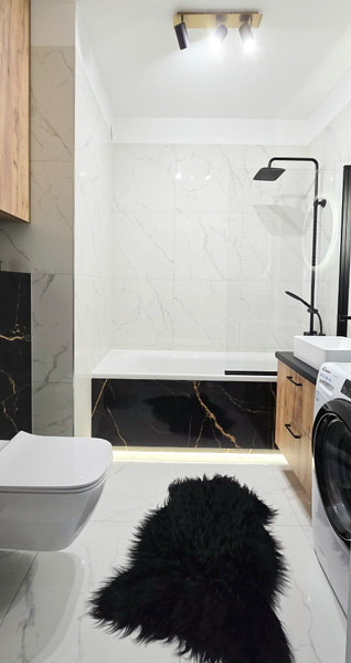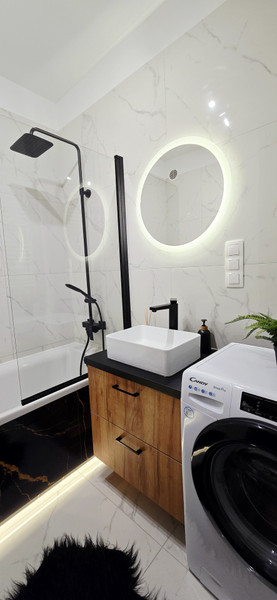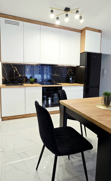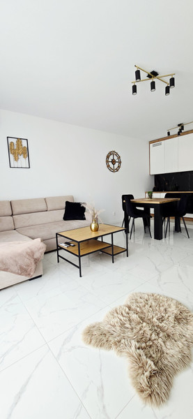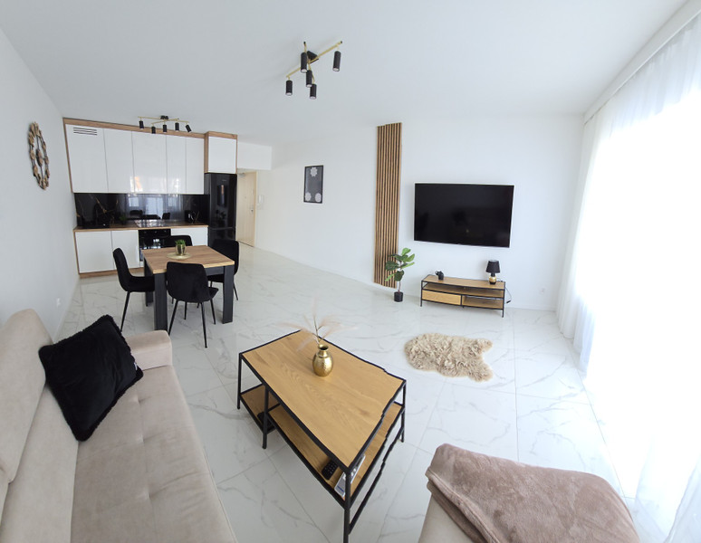 Mieszkanie jest komfortowo umeblowane, oraz nowocześnie urządzone. Szafy oraz meble kuchenne zaprojektowane i wykonane pod wymiar. Kuchnia wyposażona w piekarnik, lodówko-zamrażarkę, zmywarkę, płytę indukcyjna, okap, czajnik, akcesoria kuchenne. W salonie sofa rozkładana z szezlongiem, telewizor, szafka rtv, stolik kawowy oraz stół rozkładany z krzesłami. Sypialnia posiada łóżko 160×200 z wygodnym materacem oraz pojemną szafę i stoliki nocne. W łazience wanna z deszczownicą i natryskiem, pralka oraz pojemne szafki.