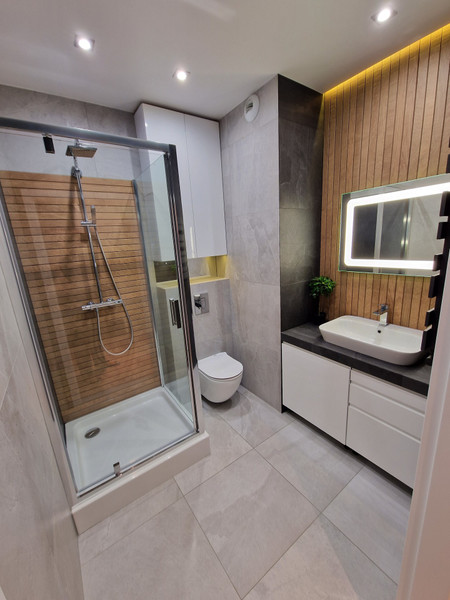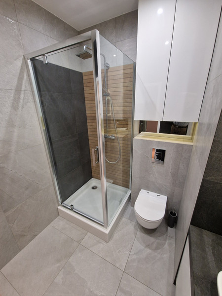 Łazienka wyposażona w komfortowy prysznic wraz z deszczownicą oraz słuchawkę prysznicową, toaletę i umywalkę. Szafki do przechowywania kosmetyków, a także zabudowany pojemnik do segregowania ubrań (jasne/ciemne).