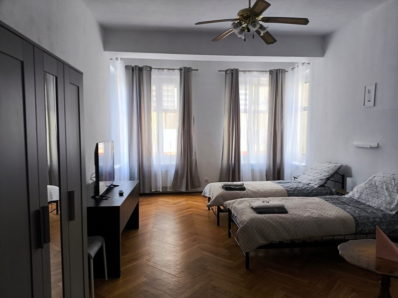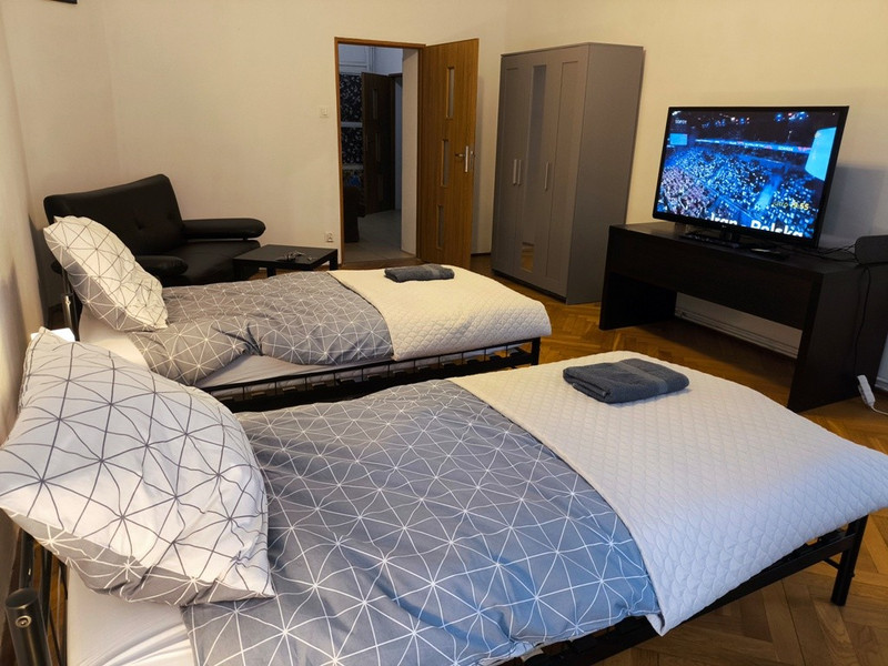 Jeden pokój o powierzchni 26 m2 , wyposażony w dwa łóżka, szafa, stolik, sofa ze skóry sztucznej dwuosobowa, telewizor 50".