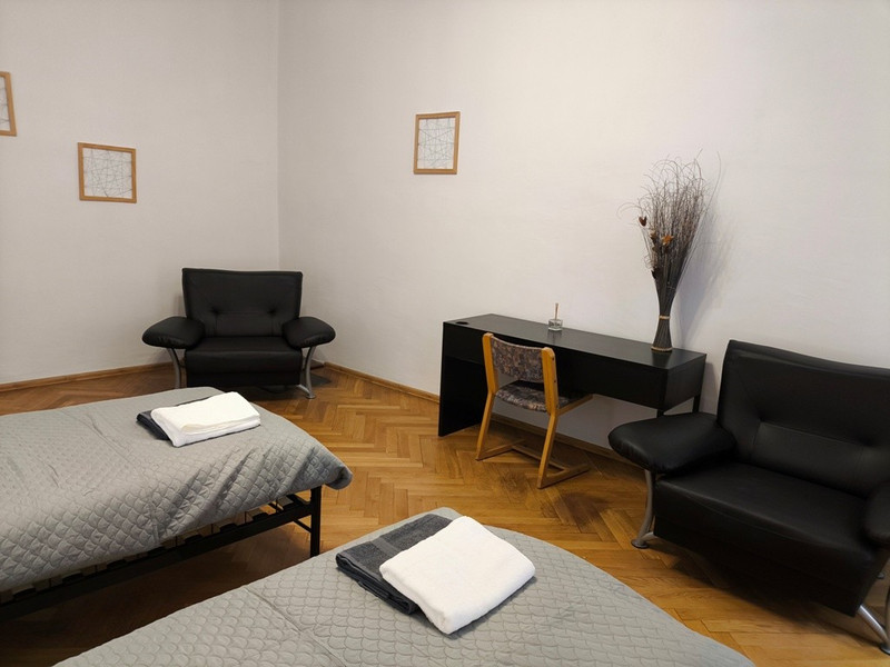 Drugi pokój 24 m2, dwa łóżka, dwa fotele ze sztucznej skóry, stolik, szafa.