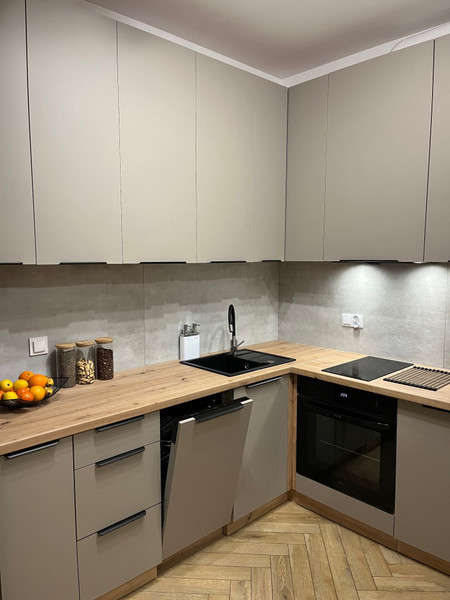 Kuchnia została w pełni wyposażona w nowy sprzęt AGD: lodówkę, zmywarkę, płytę indukcyjną, piekarnik, okap oraz podstawowe naczynia.